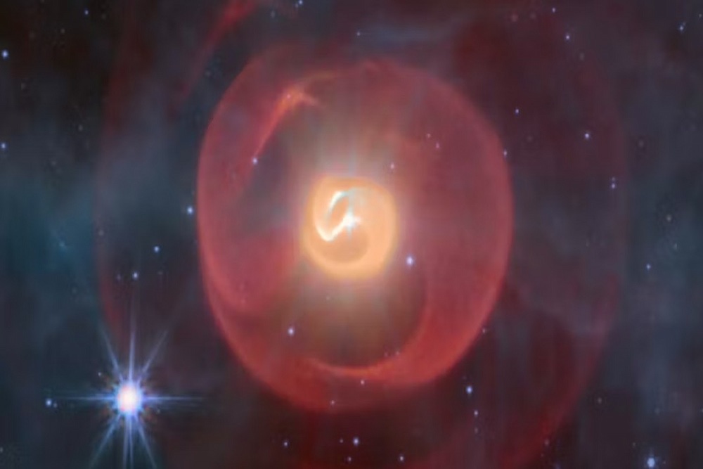 The new, much more detailed data from JWST reveals three more dust shells zooming farther out, each cooler and fainter than the last and spaced perfectly evenly, against a background of swirling dust.