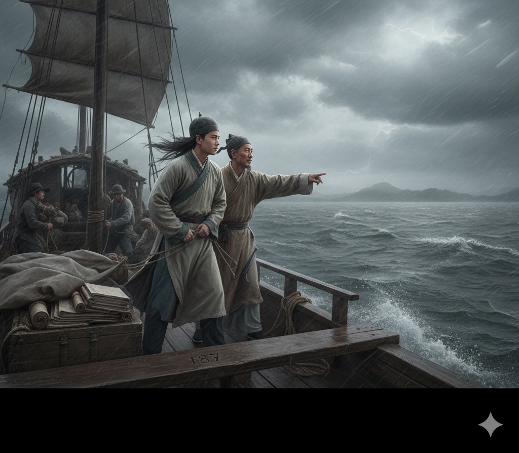 The next morning, the wind shifted, and all the ships resumed their journey. But by dusk, near Xiangyin, it reversed again — this time fiercer than before. The great boat rocked violently, tossed high on the waves, and could not reach the shore. The sailors tried everything, yet the storm could not be mastered. Fearing disaster, they sent everyone aboard to shore in a small boat, then fastened two massive cables in a desperate attempt to pull the great vessel to safety. Still, it was helplessly dragged toward the center of the lake.
