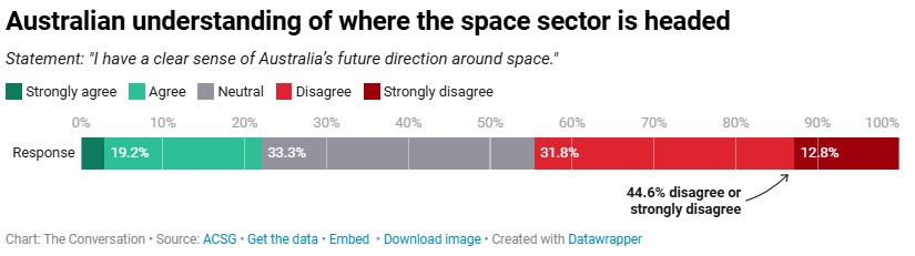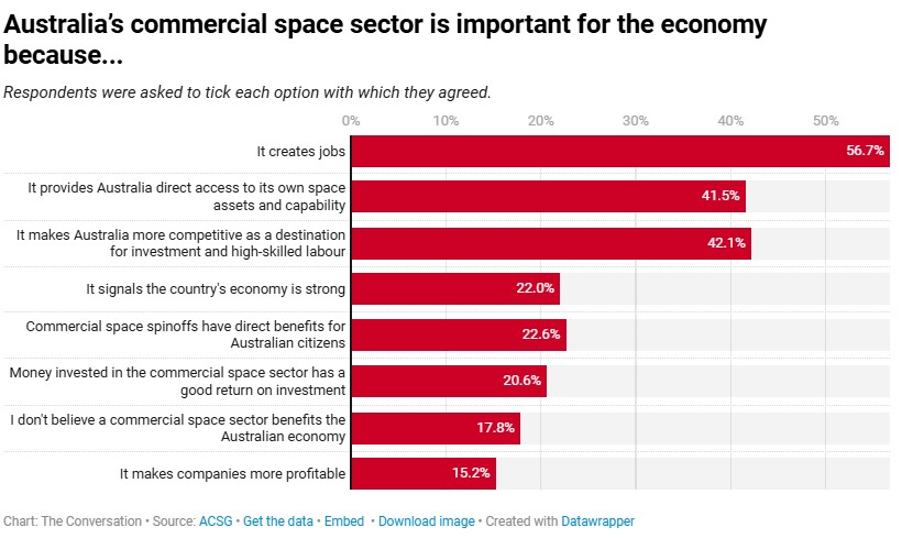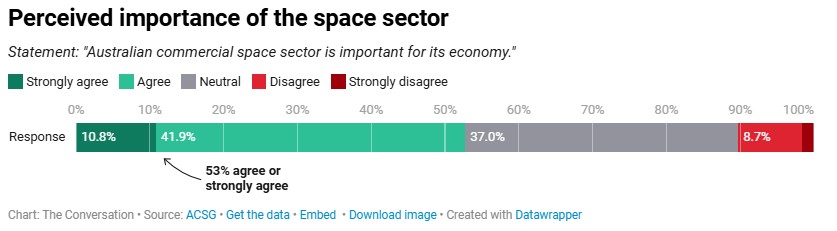 The responses show that Australians are ready to care about space, three times as likely to want to spend more on it than less, and more than half of Australians see the commercial space sector as important for the economy. Nonetheless, awareness still remains low.