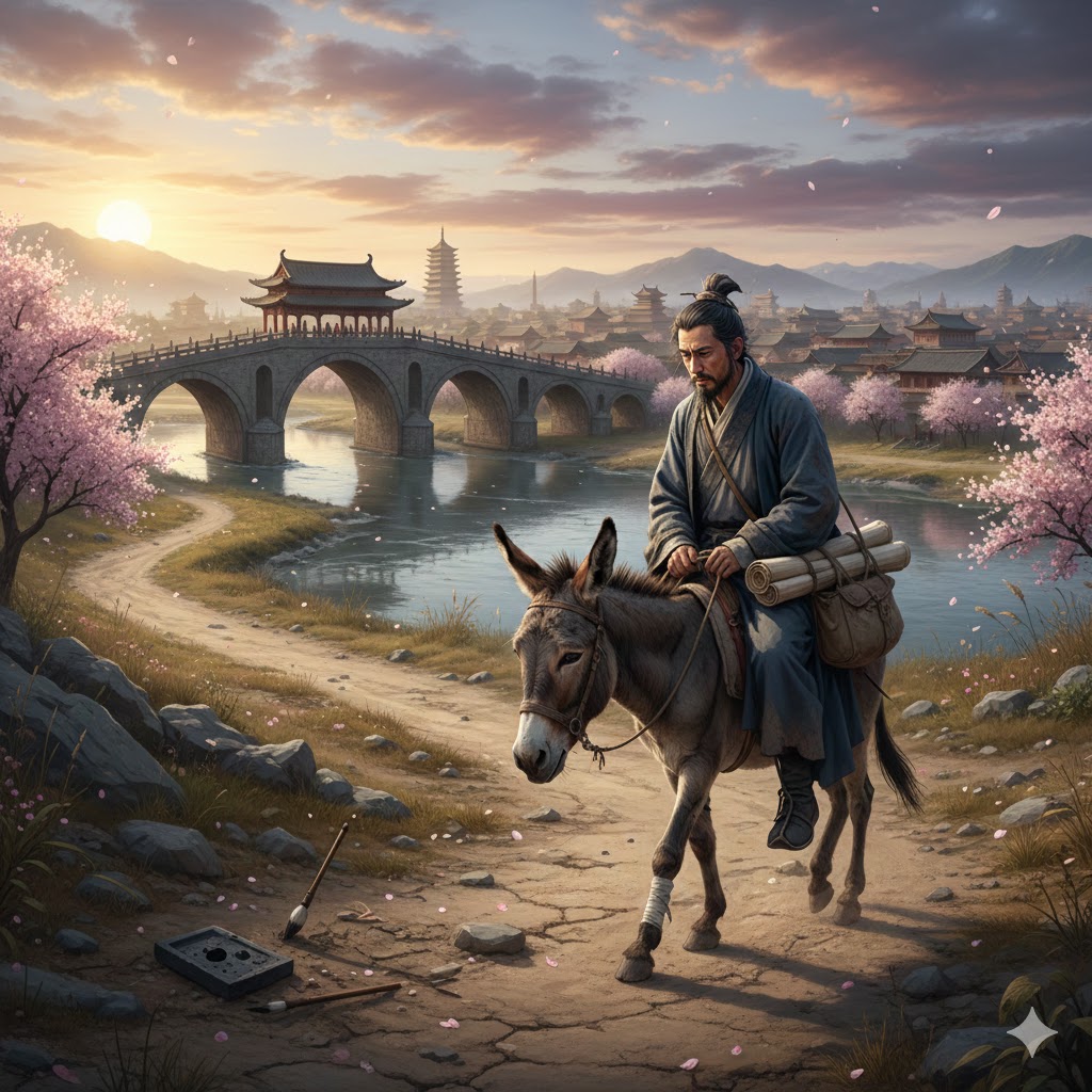 During the Tang Dynasty, Wei Dan, who had failed the imperial examinations, rode his lame donkey all the way to a particular bridge in Luoyang. There, he happened to see someone selling a large soft‑shelled turtle several feet long. The animal was in a terrible condition and looked as if it would die at any moment. Many people had gathered around it, wanting to buy and cook it. Wei Dan felt pity, approached the seller out of kindness, and agreed to exchange his donkey for the turtle. He picked it up and immediately took it to a nearby body of water to release it, giving it a new chance at life.