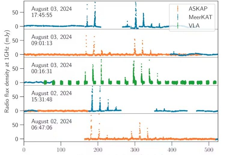 We watched GPM J1839-10 in a series dubbed “round-the-world” observations. These used three telescopes, each passing the source to the next as Earth rotated: the Australian SKA Pathfinder (ASKAP), the MeerKAT radio telescope in South Africa, and the Karl G. Jansky Very Large Array in the United States.